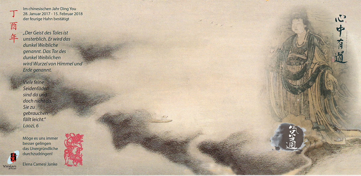 Willkommen im chinesischen Jahr Ding You vom 28. Januar 2017 bis 15. Februar 2018 des feurigen Hahnes. Laozi meint: „Der Geist des Teles ist unsterblich. Er wird das dunkle Weibliche genannt. Das Tor des dunklen Weiblichen wird Wurzel von Himmel und Erde genannt. Viele feine Seidenfäden sind da und doch nicht da. Sie z ugebrauchen fällt leicht.“ Laozi 6